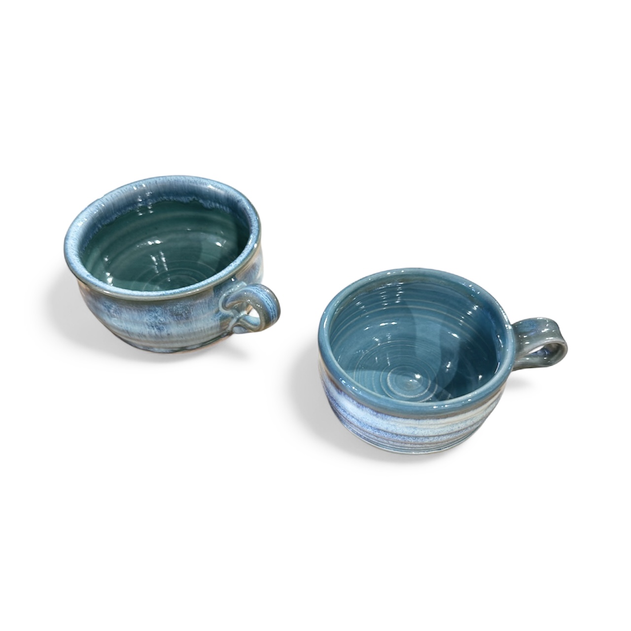 Janet Buskirk throws her blue cappuccino cup by hand, specializing mainly in blue and purple glazes. Her decades of experience have given her the technique needed to create such beautiful pieces.