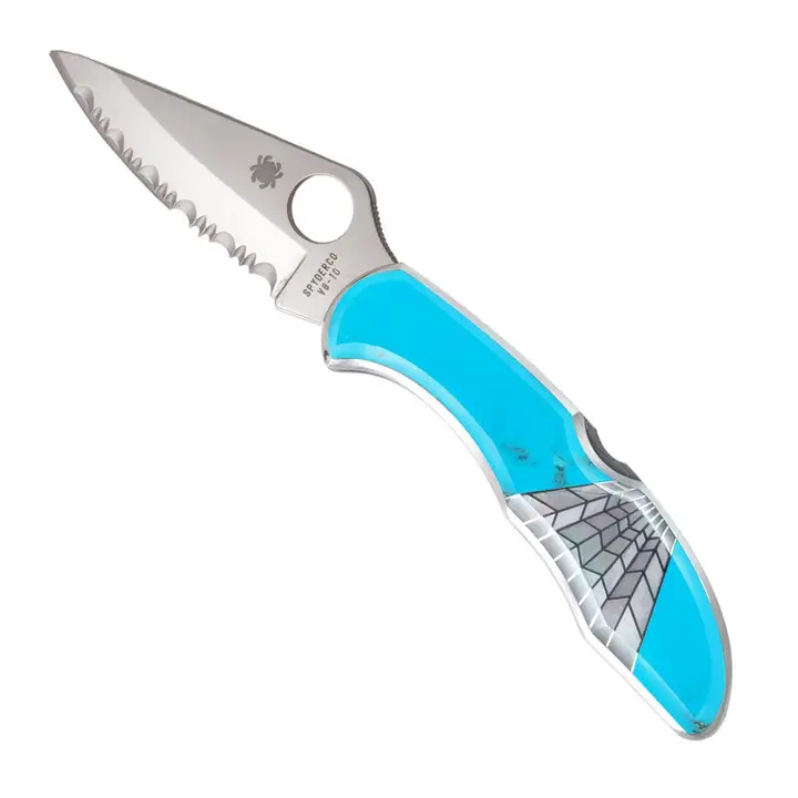 The Santa Fe Spyderco Delica knife with a round hole in the blade, a clip on the back to attach the knife in your pocket, a serrated knife blade that cuts like a saw. Delivers high performance. Knife has a pocket clip and only available with one side inlaid. Made of ATS-55 Steel and 4″ in length when closed.