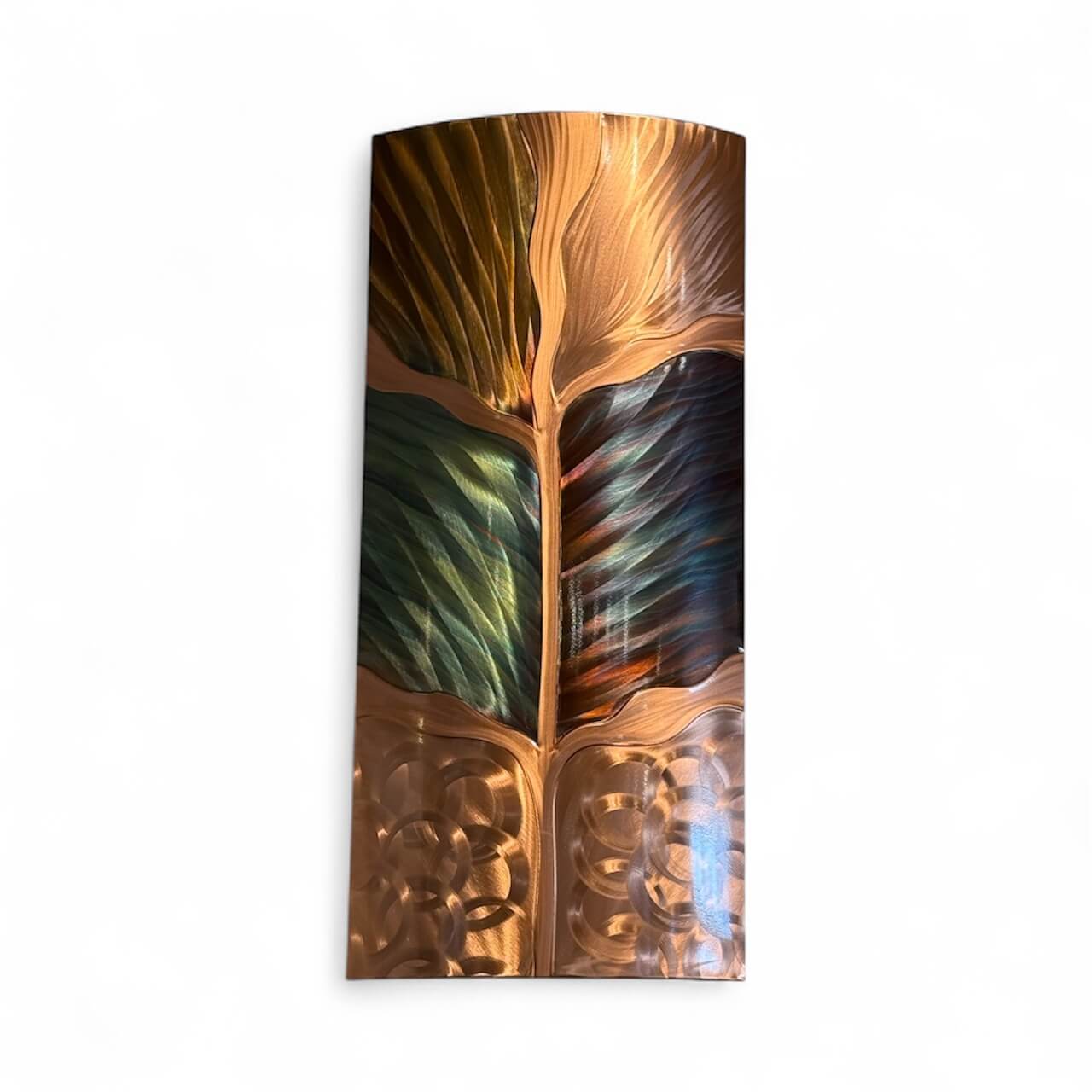 Each piece is created using a technique called Fire Painting. These pieces are created from copper, using fire to patina the metal.
